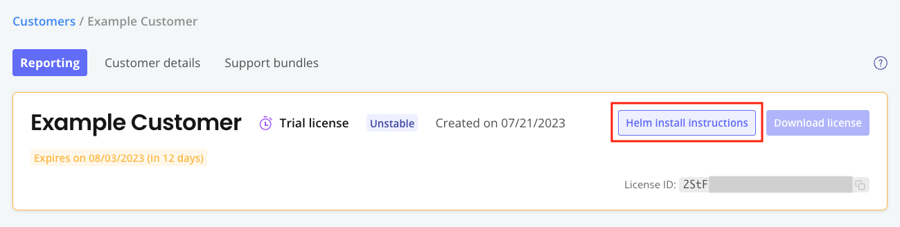 The customer used to install must have the Existing Cluster (Helm CLI) install type enabled. If installing into an air gap environment, additionally enable the Helm CLI Air Gap Instructions option for the customer. For more information about enabling install types for customers in the Vendor Portal, see Manage Install Types for a License.